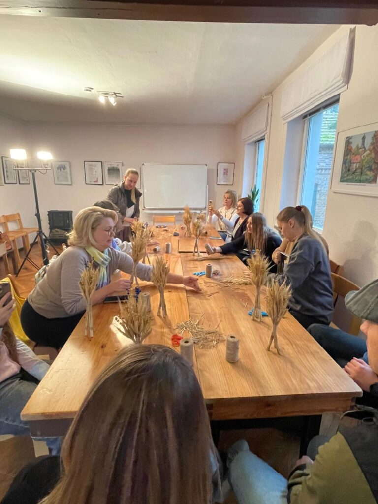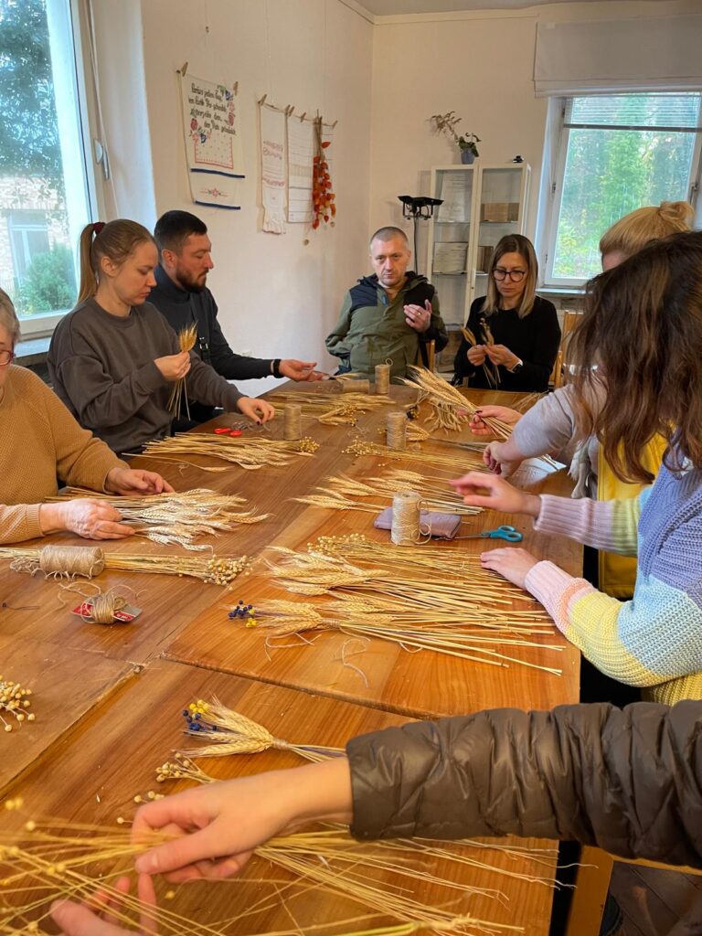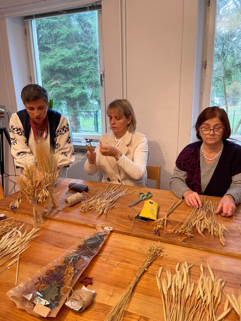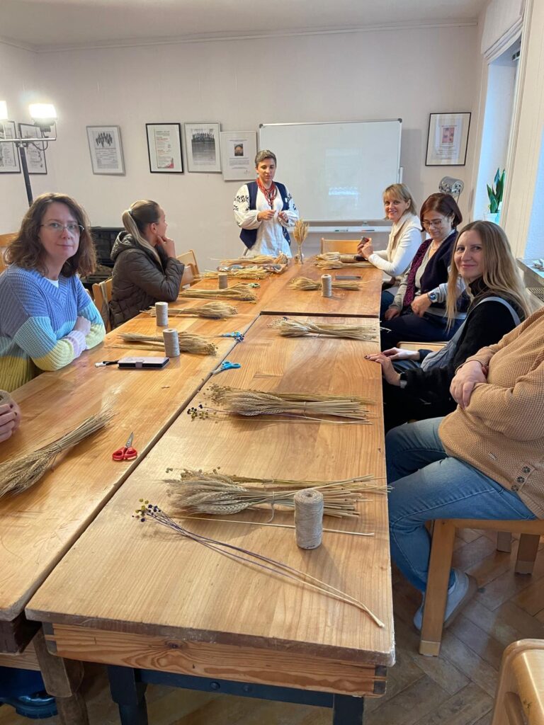 Am Samstag hat Olga in die Kunst der Diduch-Herstellung eingeführt – ein traditionelles ukrainisches Weihnachts- und Neujahrsymbol für eine gute Ernte, Wohlstand, Schutz und Frieden für die Familie. Der Diduch besteht aus einem Bündel von Getreideähren – meist Weizen, Roggen oder Hafer – die zu einem dekorativen Strohgebinde zusammengebunden werden. Traditionell ersetzt der Diduch während der Weihnachtszeit das letzte Garbenbündel aus der Ernte, das früher auf dem Feld als Opfergabe für gute Ernten stehen blieb. Der Name bedeutet wörtlich „Großvater“ und verweist auf die Verbindung zu den Ahnen.